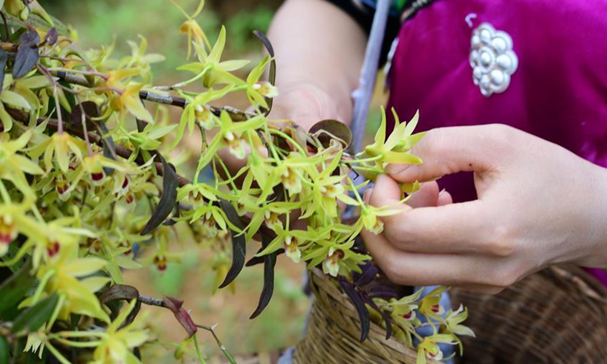 A villager picks flowers of dendrobium nobile at a cultivation base in Longchi Village of Dunzhai Town in Jinping County, southwest China's Guizhou Province, June 12, 2020. Taking full advantage of the large areas of forest and ample sunlight, local authorities have encouraged people to plant Chinese medicinal herbs including dendrobium nobile and keep bees among the trees without damaging the ecological environment. Currently, Jinping County has over 11,000 mu (about 733 hectares) of dendrobium nobile, around 91,000 mu (about 6,067 hectares) of Chinese medicinal herbs and 7,000 beehives, which have offered job opportunities to villagers and helped increase their incomes. (Xinhua/Yang Ying)