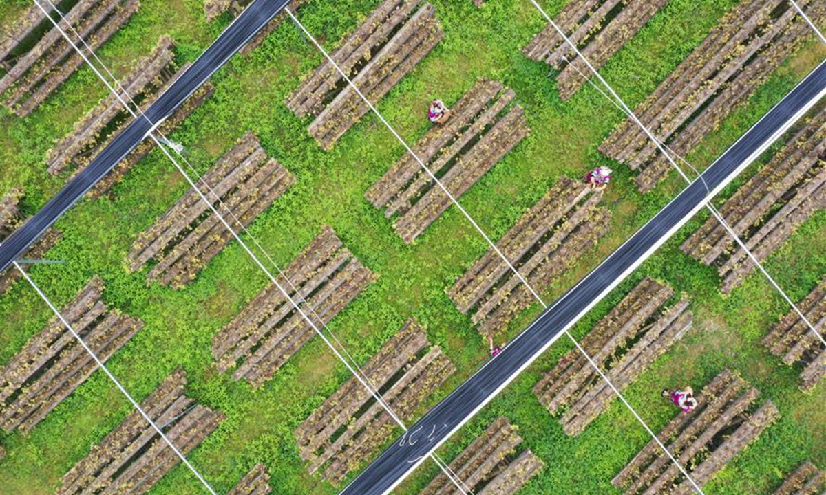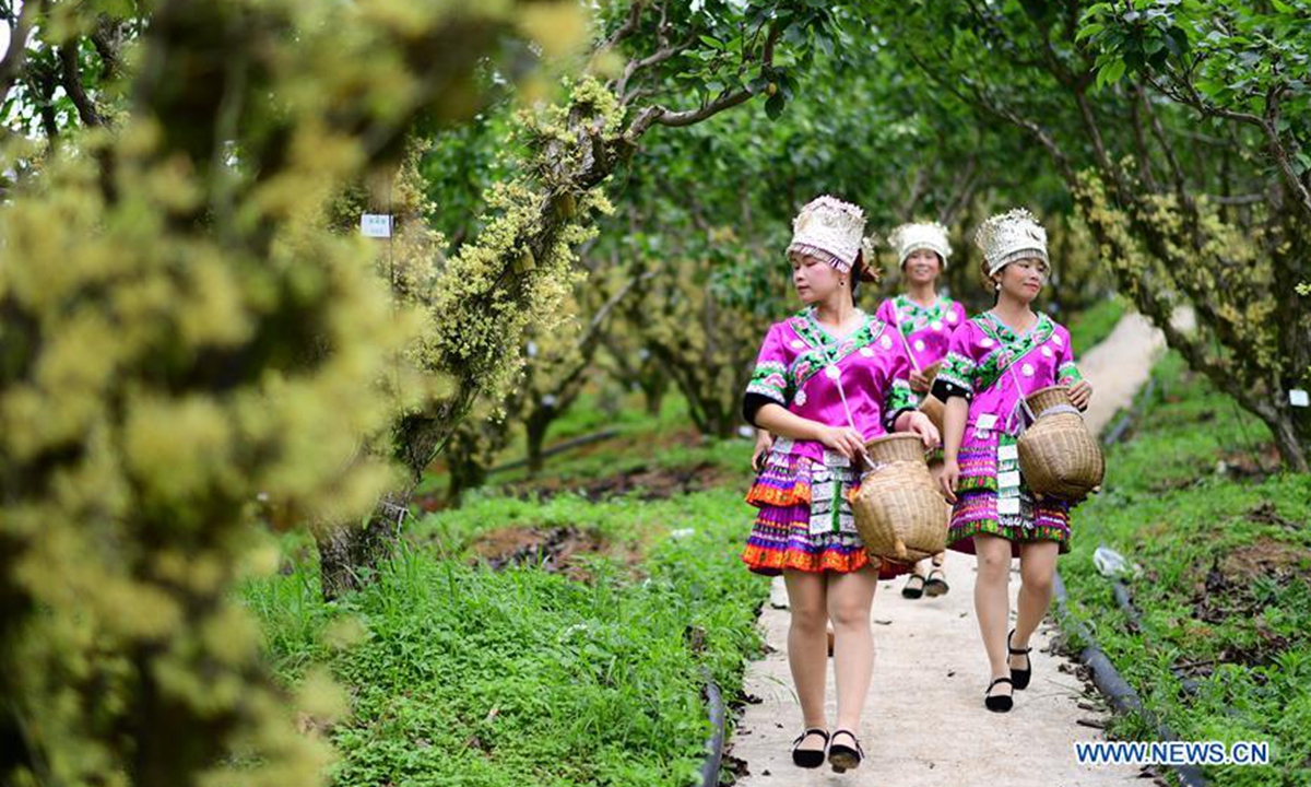 Villagers walk on the way to pick flowers of dendrobium nobile at a cultivation base in Longchi Village of Dunzhai Town in Jinping County, southwest China's Guizhou Province, June 12, 2020. Taking full advantage of the large areas of forest and ample sunlight, local authorities have encouraged people to plant Chinese medicinal herbs including dendrobium nobile and keep bees among the trees without damaging the ecological environment. Currently, Jinping County has over 11,000 mu (about 733 hectares) of dendrobium nobile, around 91,000 mu (about 6,067 hectares) of Chinese medicinal herbs and 7,000 beehives, which have offered job opportunities to villagers and helped increase their incomes. (Xinhua/Yang Ying)