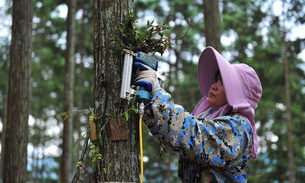A villager plants dendrobium nobile on a tree at a cultivation base in Tonggu Town of Jinping County, southwest China's Guizhou Province, June 12, 2020. Taking full advantage of the large areas of forest and ample sunlight, local authorities have encouraged people to plant Chinese medicinal herbs including dendrobium nobile and keep bees among the trees without damaging the ecological environment. Currently, Jinping County has over 11,000 mu (about 733 hectares) of dendrobium nobile, around 91,000 mu (about 6,067 hectares) of Chinese medicinal herbs and 7,000 beehives, which have offered job opportunities to villagers and helped increase their incomes. (Xinhua/Yang Ying)