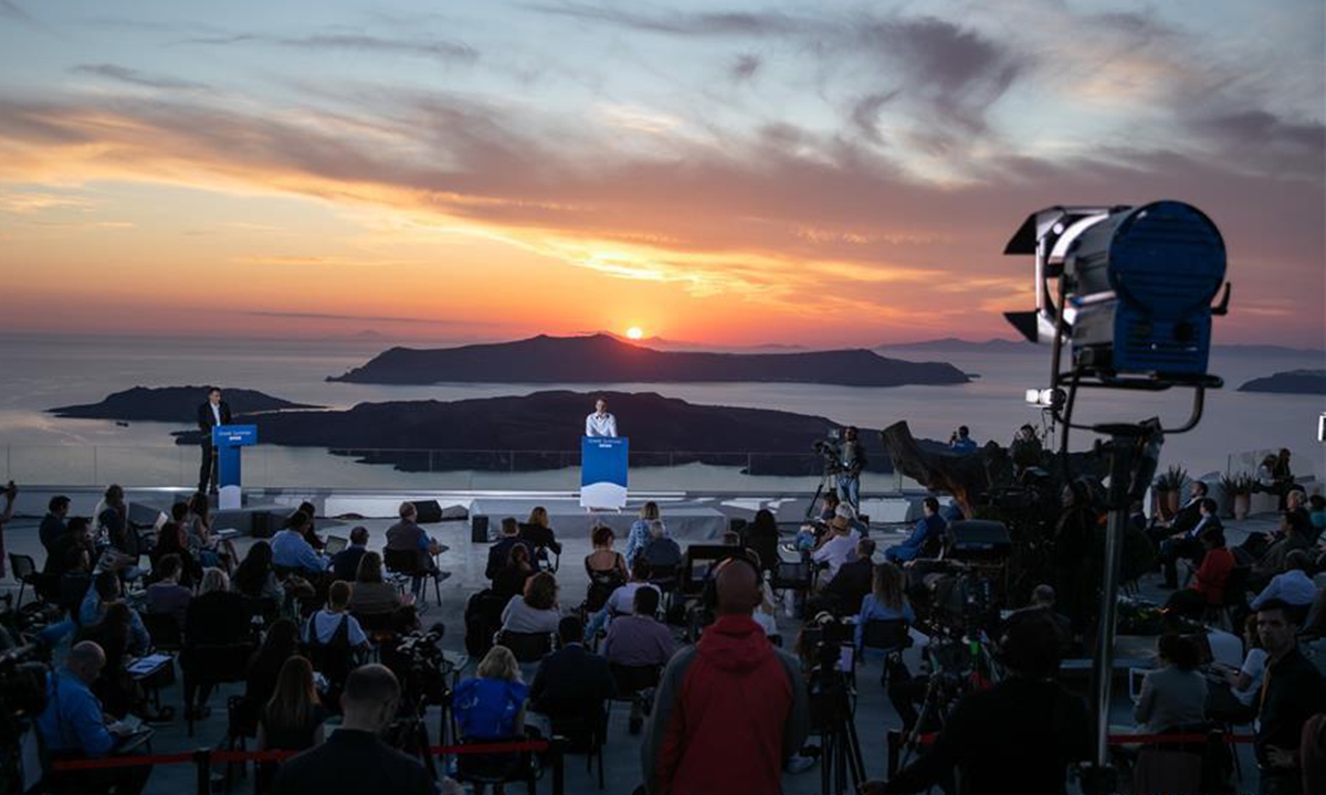 Photo taken on June 13, 2020 shows a general view of a press conference held by Greek Prime Minister Kyriakos Mitsotakis on Santorini Island, Greece. Greece is ready to welcome visitors again with health safety as the top priority in the new COVID-19 era, Prime Minister Kyriakos Mitsotakis said on Saturday during a visit to the Santorini Island. (Photo by Lefteris Partsalis/Xinhua)