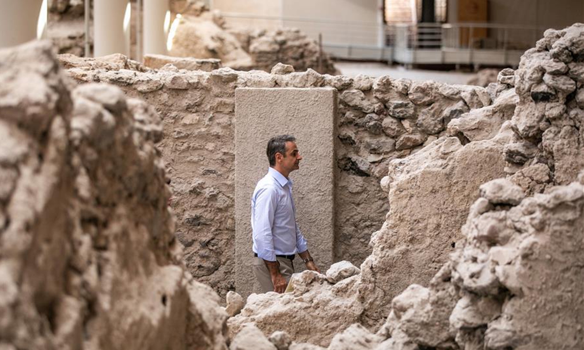 Greek Prime Minister Kyriakos Mitsotakis visits the archeological site of Akrotiri, a prehistoric settlement that was destroyed by the eruption of Santorini's volcano, on Santorini Island, Greece, on June 13, 2020. Greece is ready to welcome visitors again with health safety as the top priority in the new COVID-19 era, Prime Minister Kyriakos Mitsotakis said on Saturday during a visit to the Santorini Island. (Photo by Lefteris Partsalis/Xinhua)