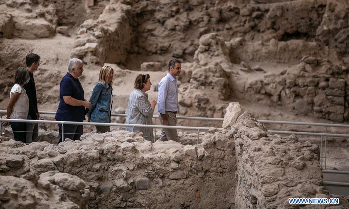 Greek Prime Minister Kyriakos Mitsotakis (1st R) visits the archeological site of Akrotiri, a prehistoric settlement that was destroyed by the eruption of Santorini's volcano, on Santorini Island, Greece, on June 13, 2020. Greece is ready to welcome visitors again with health safety as the top priority in the new COVID-19 era, Prime Minister Kyriakos Mitsotakis said on Saturday during a visit to the Santorini Island. (Photo by Lefteris Partsalis/Xinhua)