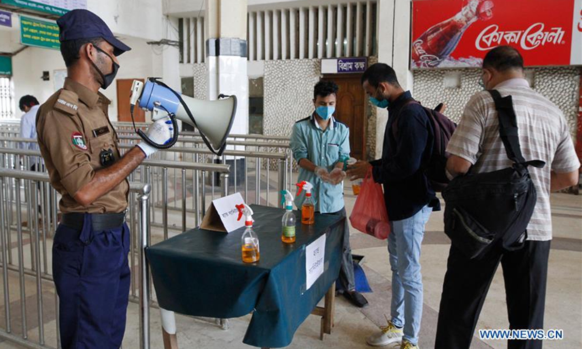 Passengers disinfect their hands at the Kamlapur Railway Station in Dhaka, Bangladesh, on May 31, 2020. Offices, businesses and transport services resumed in Bangladesh Sunday on a limited scale after being suspended over two months following the COVID-19 outbreak. (Str/Xinhua)