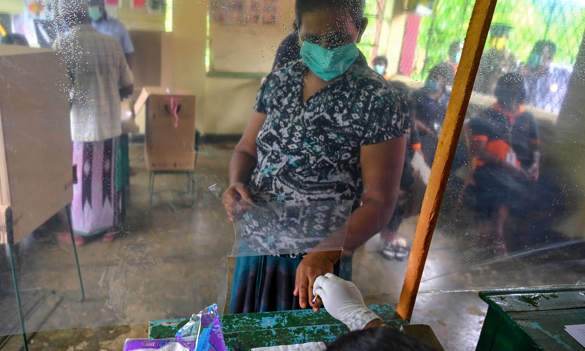 An election official behind a plastic sheet marks the finger of a voter with ink during a mock election to test the guidelines implemented against the COVID-19 in Ingiriya of Kalutara district in Western Province on Sunday. Sri Lanka will hold parliamentary elections on August 5, more than three months late due to the virus. A mock election will be held to test new health measures at polling booths and counting centres. Photo: AFP