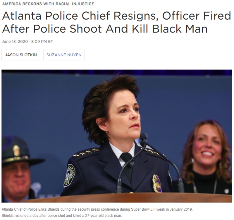 A screenshot taken from npr.org on June 14, 2020, shows the title of its report one day earlier about the resignation of Atlanta police chief Erika Shields, together with her photo. (Xinhua)