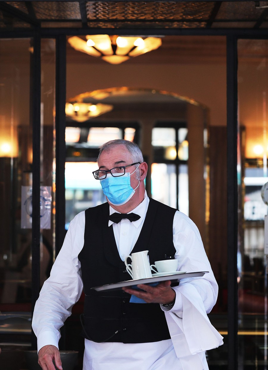 A waiter wearing a mask works at Cafe de Flore at its reopening day in Paris, France, June 2, 2020. (Xinhua/Gao Jing)