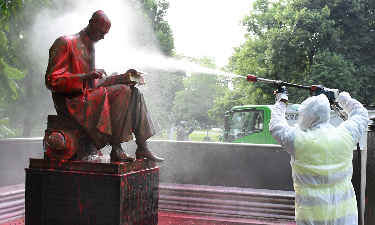 A municipal employee cleans the statue of famous Italian journalist Indro Montanelli in Milan on Sunday, a day after it was defaced with red paint and tagged with the inscription "racist, rapist." Photo: AFP