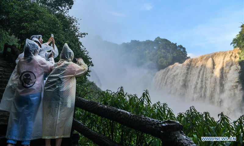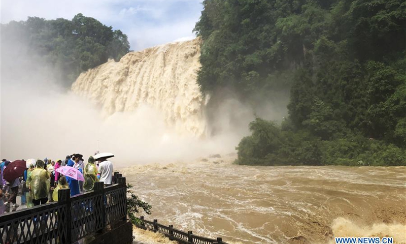 Tourists enjoy a view of the Huangguoshu Waterfall in Anshun, southwest China's Guizhou Province on June 14, 2020. (Xinhua/Yang Wenbin)