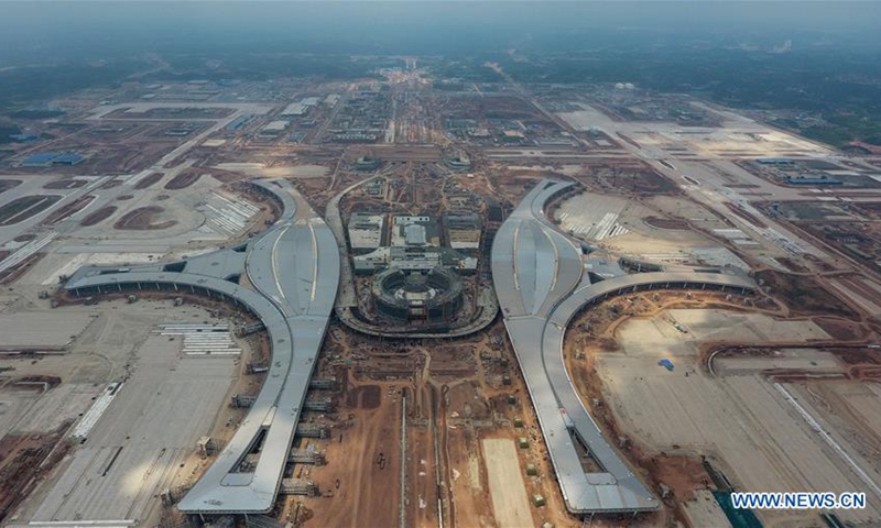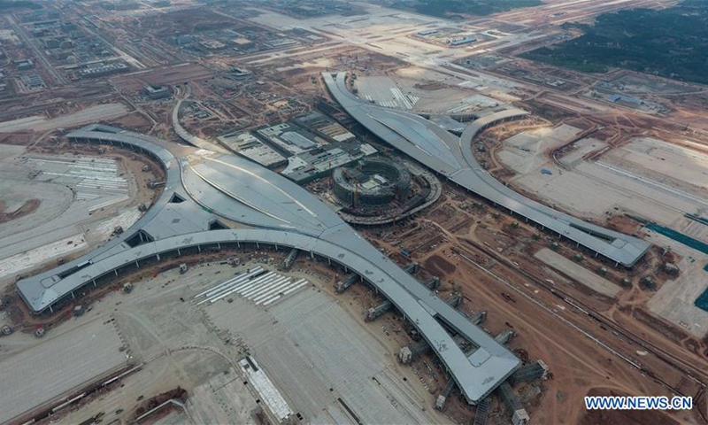 Aerial photo taken on June 15, 2020 shows the construction site of the Chengdu Tianfu International Airport in Chengdu, southwest China's Sichuan Province. The construction of the Chengdu Tianfu International Airport is carried out smoothly in Chengdu. The first phase of the airport construction includes 3 runways and a terminal which covers an area of 600,000 square meters. (Xinhua/Wang Xi)