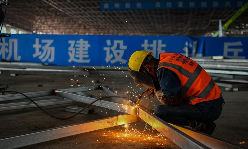 A worker is busy at the construction site of the Chengdu Tianfu International Airport in Chengdu, southwest China's Sichuan Province, June 15, 2020. The construction of the Chengdu Tianfu International Airport is carried out smoothly in Chengdu. The first phase of the airport construction includes 3 runways and a terminal which covers an area of 600,000 square meters. (Xinhua/Wang Xi)