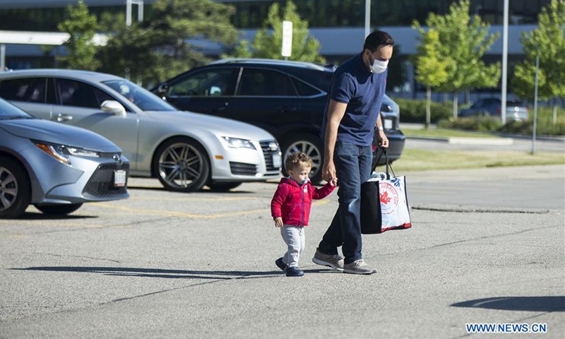 A man wearing a face mask with his boy arrives at a childcare center in Mississauga, Ontario, Canada, on June 15, 2020. The province of Ontario has allowed all childcare centers to reopen since June 12. (Photo by Zou Zheng/Xinhua)