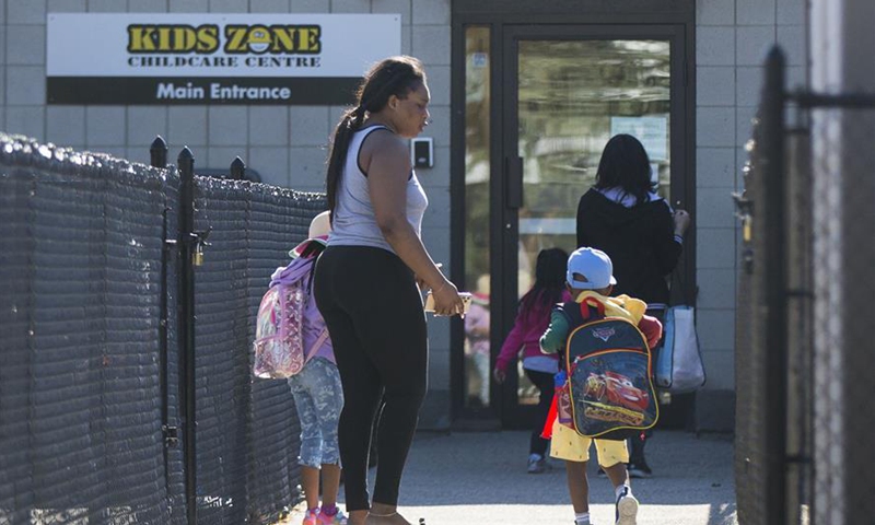 Mothers with their kids line up with a social distance to enter a childcare center in Mississauga, Ontario, Canada, on June 15, 2020. The province of Ontario has allowed all childcare centers to reopen since June 12. (Photo by Zou Zheng/Xinhua)