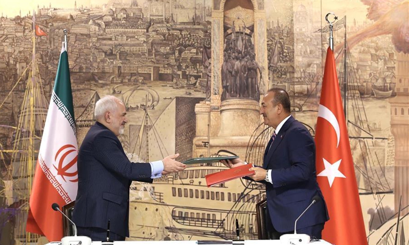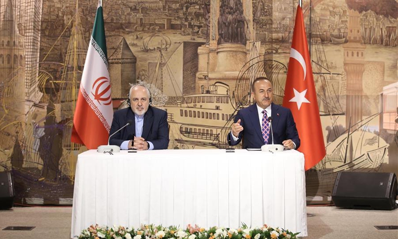Turkish Foreign Minister Mevlut Cavusoglu (R) and Iranian Foreign Minister Mohammad Javad Zarif attend a press conference in Istanbul, Turkey, on June 15, 2020. Zarif said Turkey and Iran are working to reopen their border and resume flights after they have been suspended for more than three months due to the spread of the COVID-19 pandemic. (Xinhua)