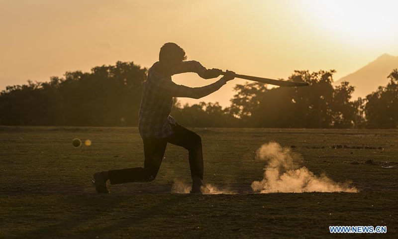 A man plays cricket at sunset in a village about 70 kilometers south of Srinagar city, the summer capital of Indian-controlled Kashmir, June 14, 2020. (Xinhua/Javed Dar)