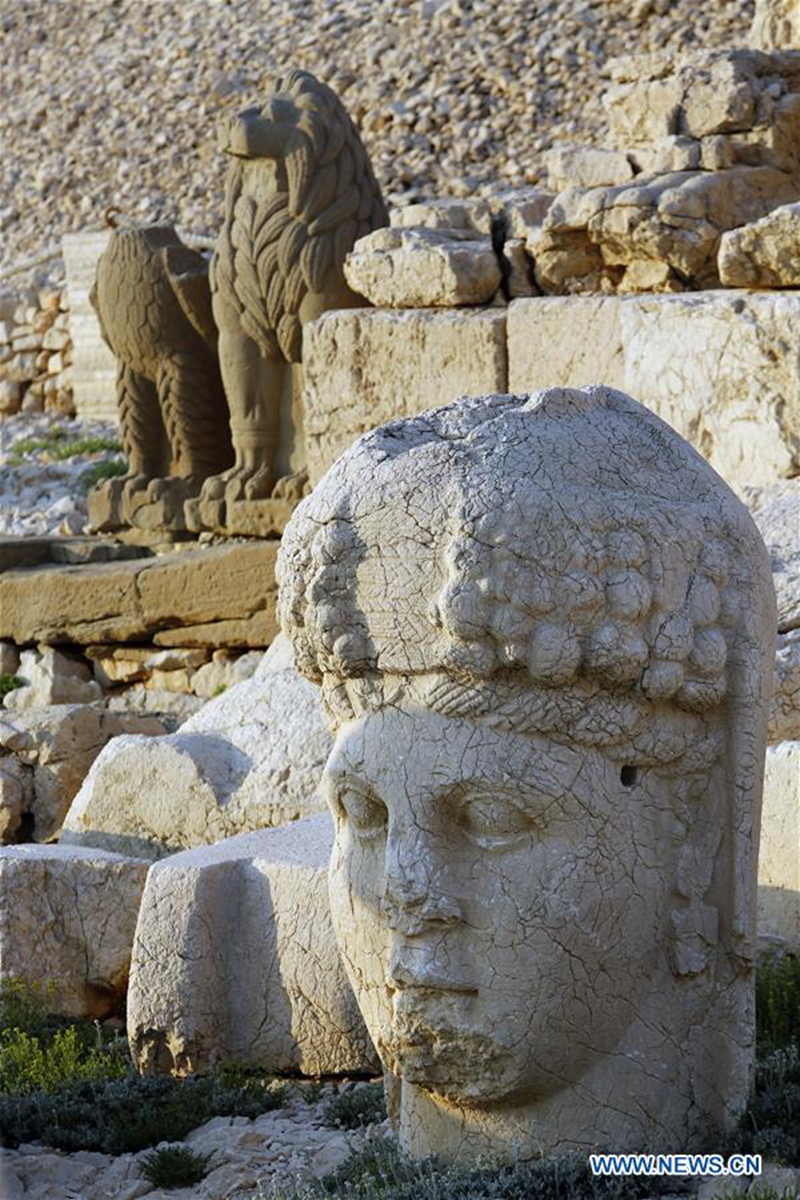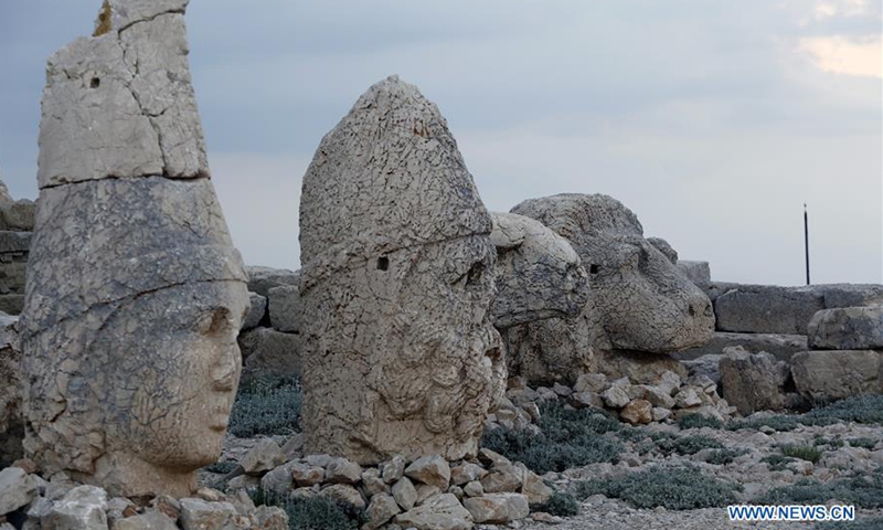 Photo taken on June 14, 2020 shows statues at the tomb-sanctuary on the top of Mount Nemrut in Turkey. Mount Nemrut lies in Turkey's southeastern province of Adiyaman. In 1987, it was listed as a UNESCO World Heritage Site. Mount Nemrut is known for the ruins of the tomb-sanctuary on its top. (Photo by Mustafa Kaya/Xinhua)