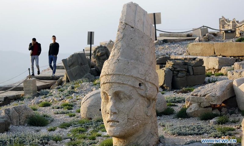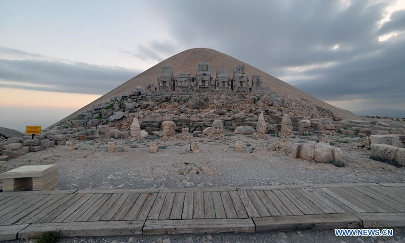 Photo taken on June 14, 2020 shows the tomb-sanctuary on the top of Mount Nemrut in Turkey. Mount Nemrut lies in Turkey's southeastern province of Adiyaman. In 1987, it was listed as a UNESCO World Heritage Site. Mount Nemrut is known for the ruins of the tomb-sanctuary on its top. (Photo by Mustafa Kaya/Xinhua)