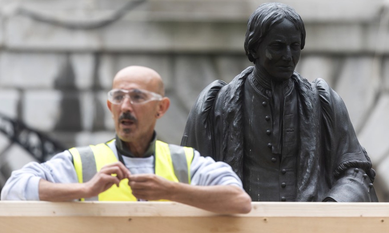 A worker boards up the statue of Thomas Guy at Guy's Hospital in London, Britain, on June 12, 2020. (Photo by Ray Tang/Xinhua)