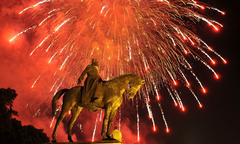 Fire works explode over the statue of King Leopold II (1835-1909) to celebrate the National Day in Brussels, capital of Belgium, late on July 21, 2009. (Xinhua/Wu Wei)