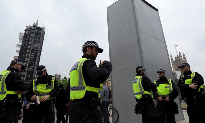 Police officers stand guard next to a protective box installed around the statue of Winston Churchill during a protest in London, Britain, on June 12, 2020. (Photo by Tim Ireland/Xinhua)