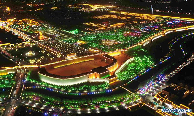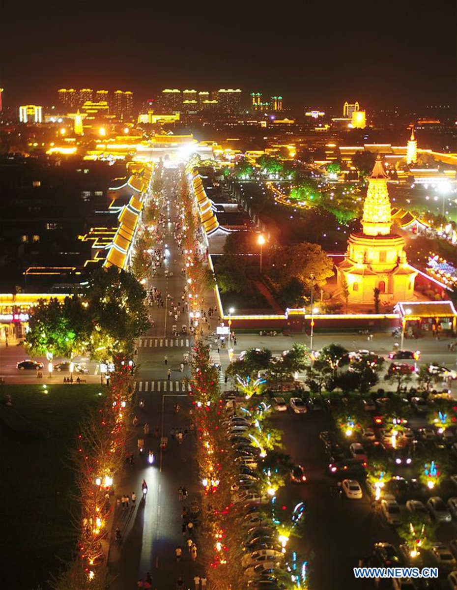 Aerial photo taken on June 14, 2020 shows a night view of the Zhengding ancient town in Shijiazhuang, north China's Hebei Province. (Photo by Xu Jianyuan/Xinhua)