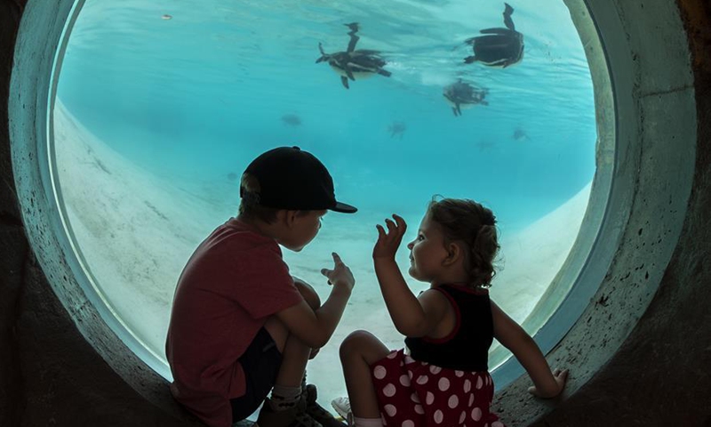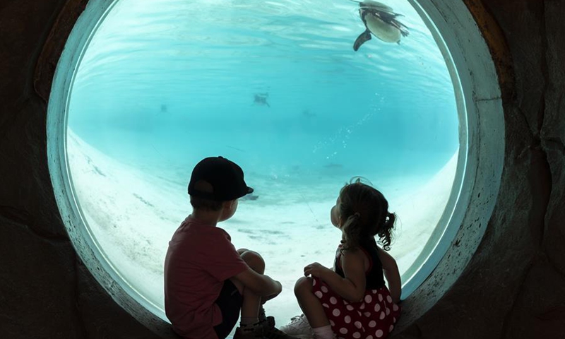 Kids look at penguins through an underwater viewer at ZSL (the Zoological Society of London) London Zoo on the first day of its reopening since lockdown restrictions eased in London, Britain on June 15, 2020. As non-essential stores reopened and more students headed back to schools in England on Monday for the first time in almost three-months, zoos and safari parks across the country were also allowed to reopen Monday. (Xinhua/Han Yan)