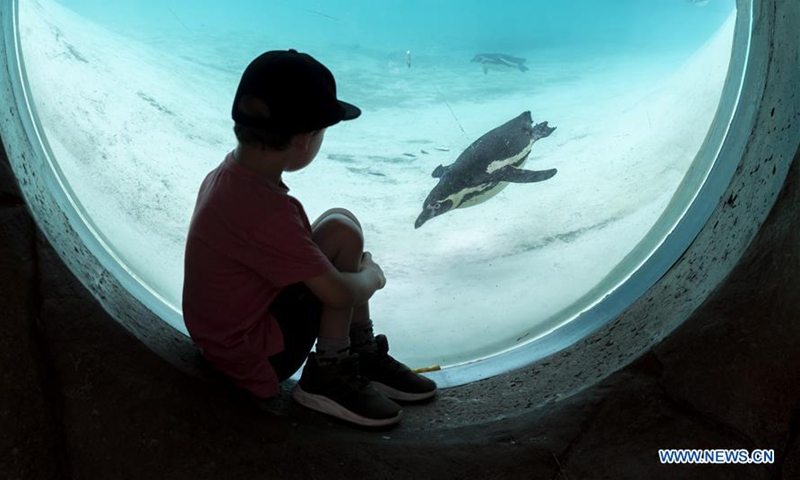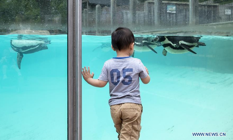 A boy looks at penguins at ZSL (the Zoological Society of London) London Zoo on the first day of its reopening since lockdown restrictions eased in London, Britain on June 15, 2020. As non-essential stores reopened and more students headed back to schools in England on Monday for the first time in almost three-months, zoos and safari parks across the country were also allowed to reopen Monday. (Xinhua/Han Yan)