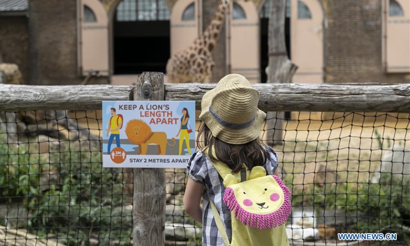A girl looks at a giraffe at ZSL (the Zoological Society of London) London Zoo on the first day of its reopening since lockdown restrictions eased in London, Britain on June 15, 2020. As non-essential stores reopened and more students headed back to schools in England on Monday for the first time in almost three-months, zoos and safari parks across the country were also allowed to reopen Monday. (Xinhua/Han Yan)