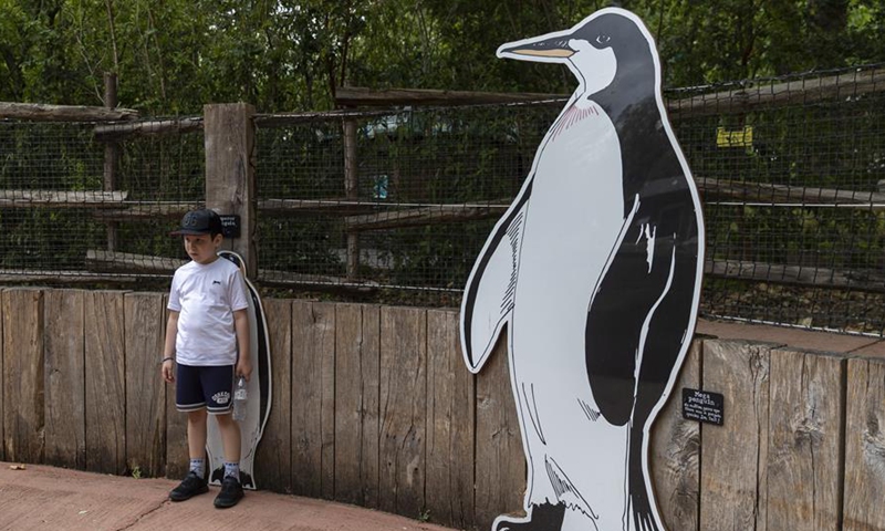 A boy poses with a penguin picture at ZSL (the Zoological Society of London) London Zoo on the first day of its reopening since lockdown restrictions eased in London, Britain on June 15, 2020. As non-essential stores reopened and more students headed back to schools in England on Monday for the first time in almost three-months, zoos and safari parks across the country were also allowed to reopen Monday. (Xinhua/Han Yan)