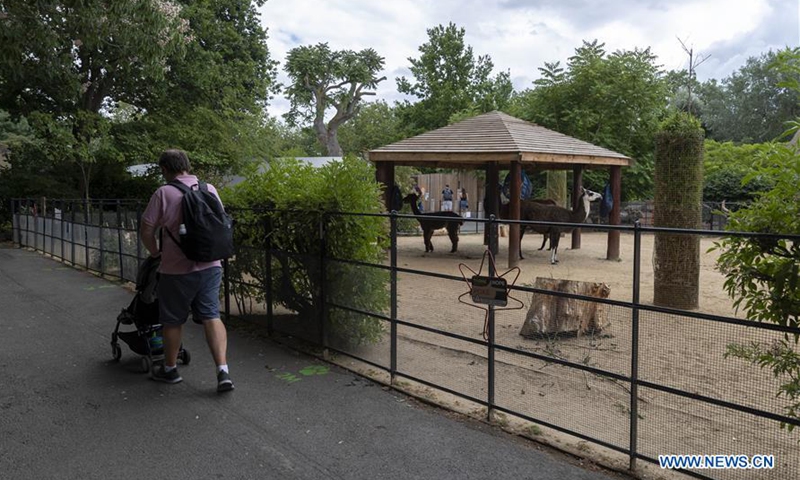 Visitors walk past llamas at ZSL (the Zoological Society of London) London Zoo on the first day of its reopening since lockdown restrictions eased in London, Britain on June 15, 2020. As non-essential stores reopened and more students headed back to schools in England on Monday for the first time in almost three-months, zoos and safari parks across the country were also allowed to reopen Monday. (Xinhua/Han Yan)