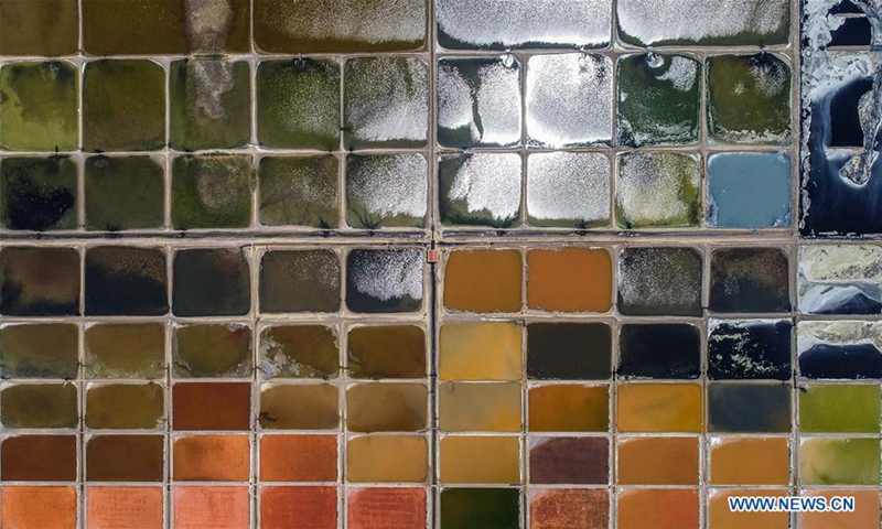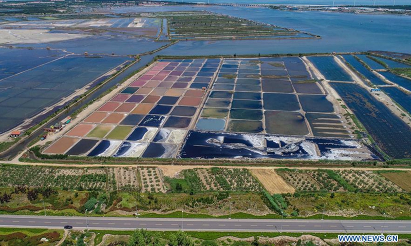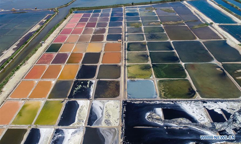 Aerial photo taken on June 15, 2020 shows a patchwork of salt fields in Gangxi Township, Rongcheng, east China's Shandong Province. (Photo by Li Xinjun/Xinhua)