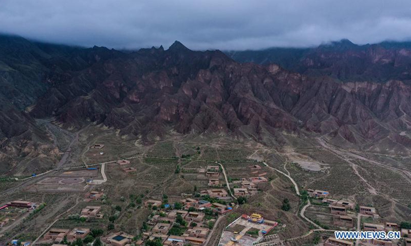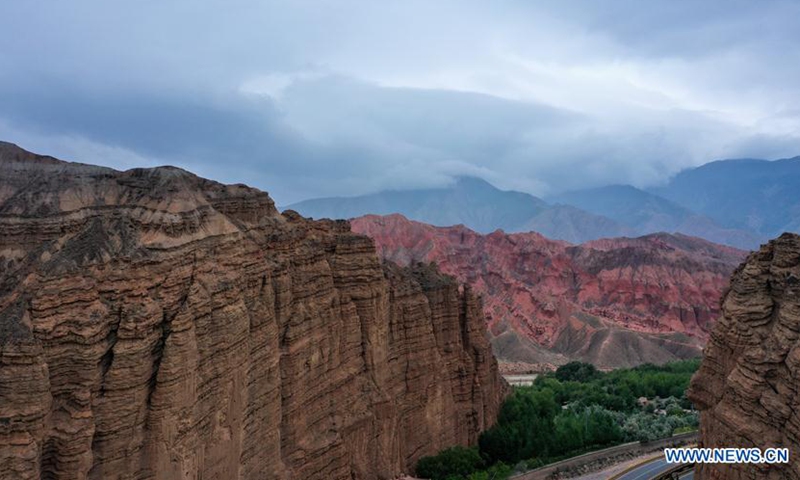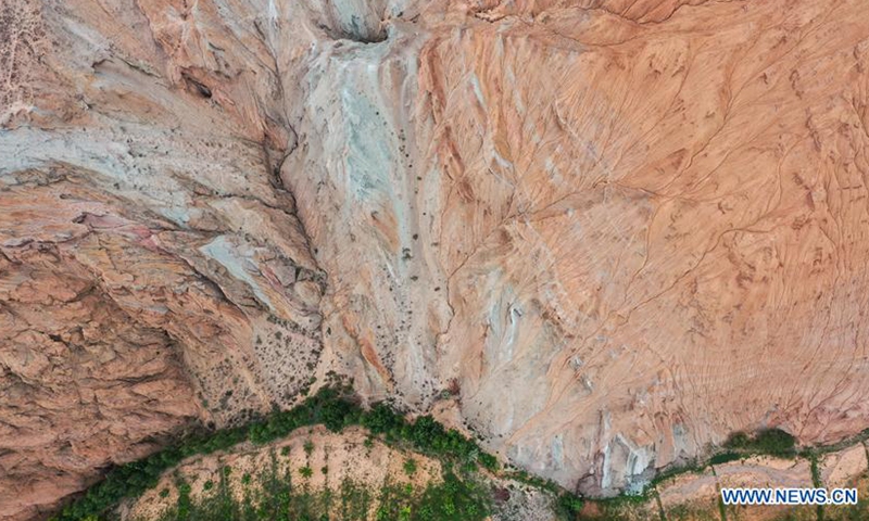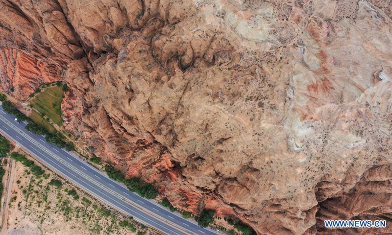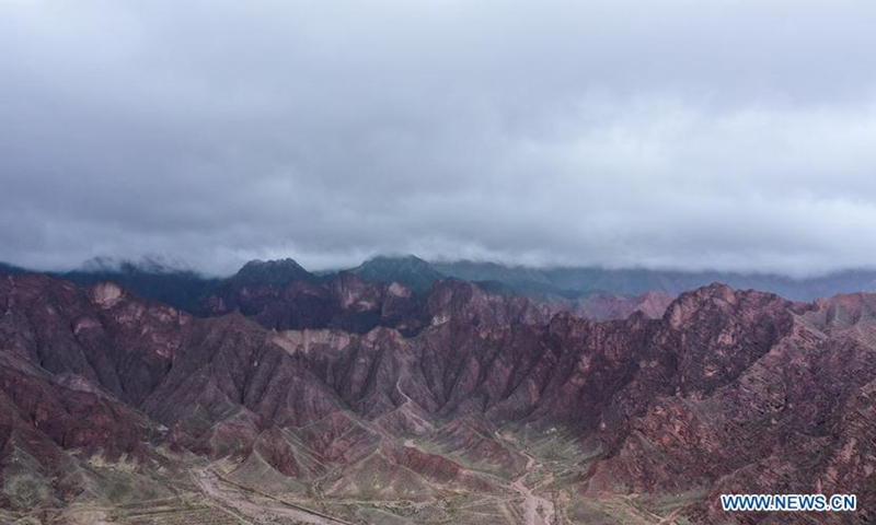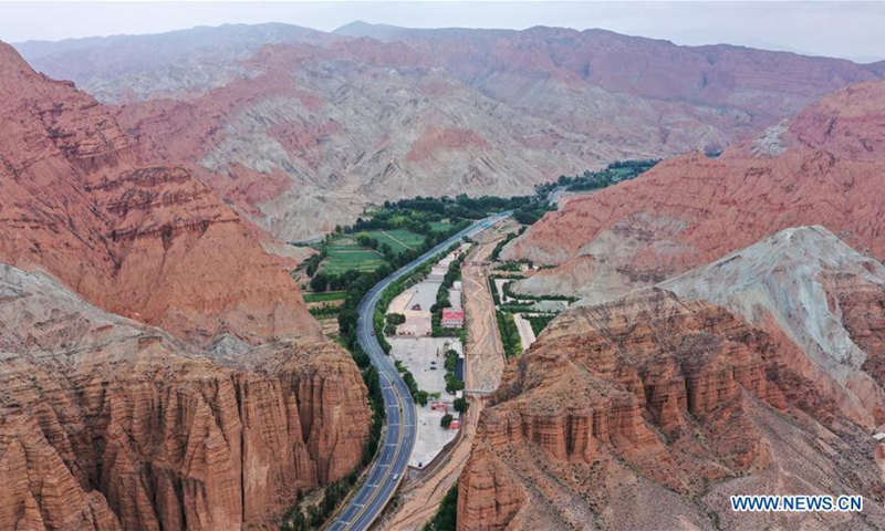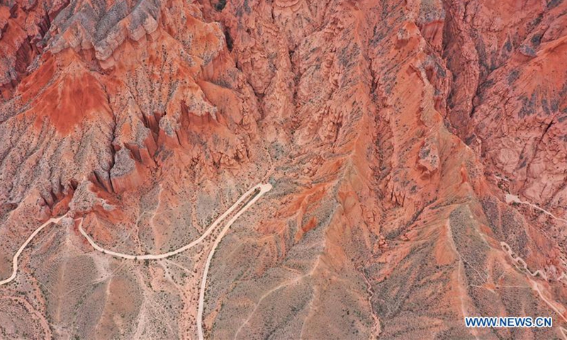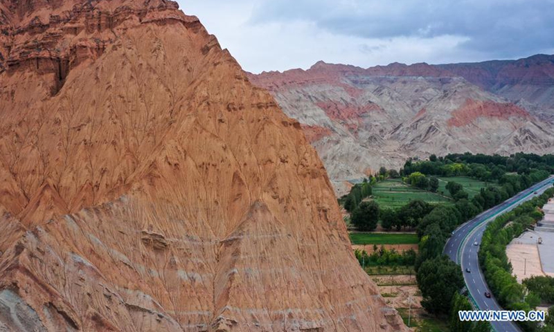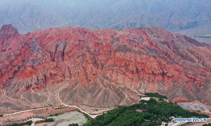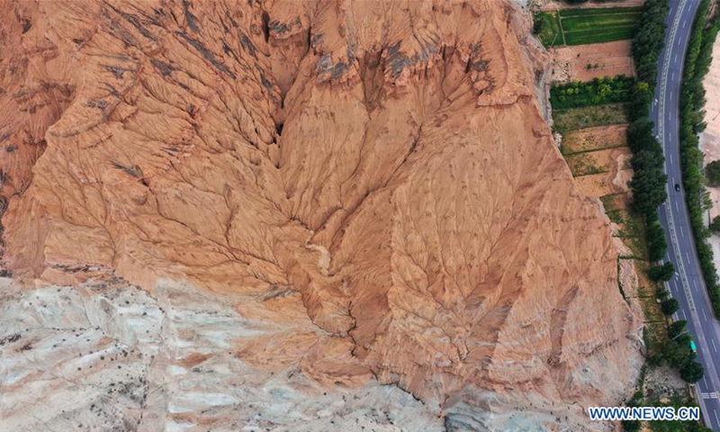 Aerial photo taken on June 15, 2020 shows a view of Danxia landform, a landscape characterized by reddish sandstone features, in Guide County, northwest China's Qinghai Province. (Xinhua/Wu Gang)