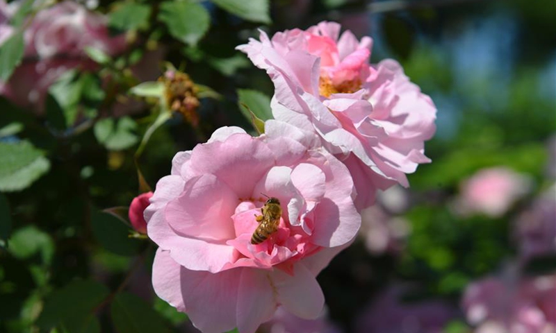 A bee gathers honey from roses at Changchun Children's Park in Changchun, northeast China's Jilin Province, June 16, 2020. (Xinhua/Lin Hong)