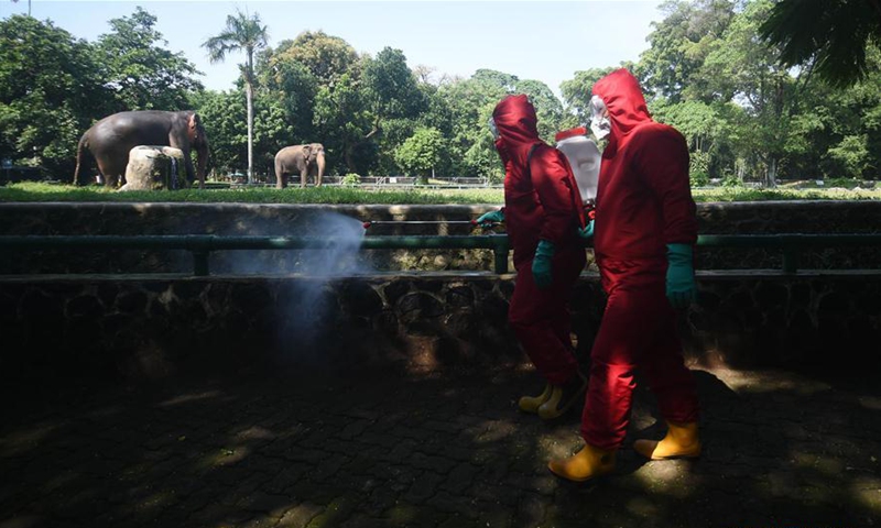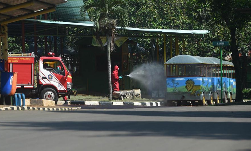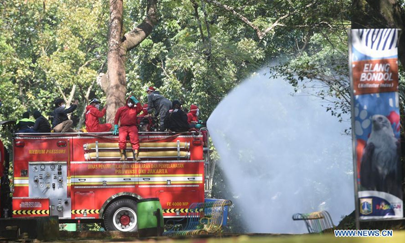 Indonesian firefighters spray disinfectant at Ragunan Zoo in Jakarta, Indonesia, June 17, 2020. Ragunan Zoo will reopen this weekend after weeks of closure due to the restrictions imposed to combat the spread of COVID-19. (Xinhua/Zulkarnain)