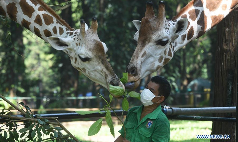 A keeper wearing a face mask feeds giraffes at Ragunan Zoo in Jakarta, Indonesia, June 17, 2020. Ragunan Zoo will reopen this weekend after weeks of closure due to the restrictions imposed to combat the spread of COVID-19. (Xinhua/Zulkarnain)