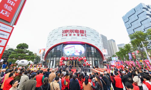 A brick-and-mortar electric appliance store of China's e-commerce giant JD.com Inc (JD) opens on Monday in Southwest China's Chongqing Municipality. Thousands of local consumers rushed to take a look. Covering an area of 50,000 square meters, the store is JD's first in the world based on borderless retail. Photo: VCG