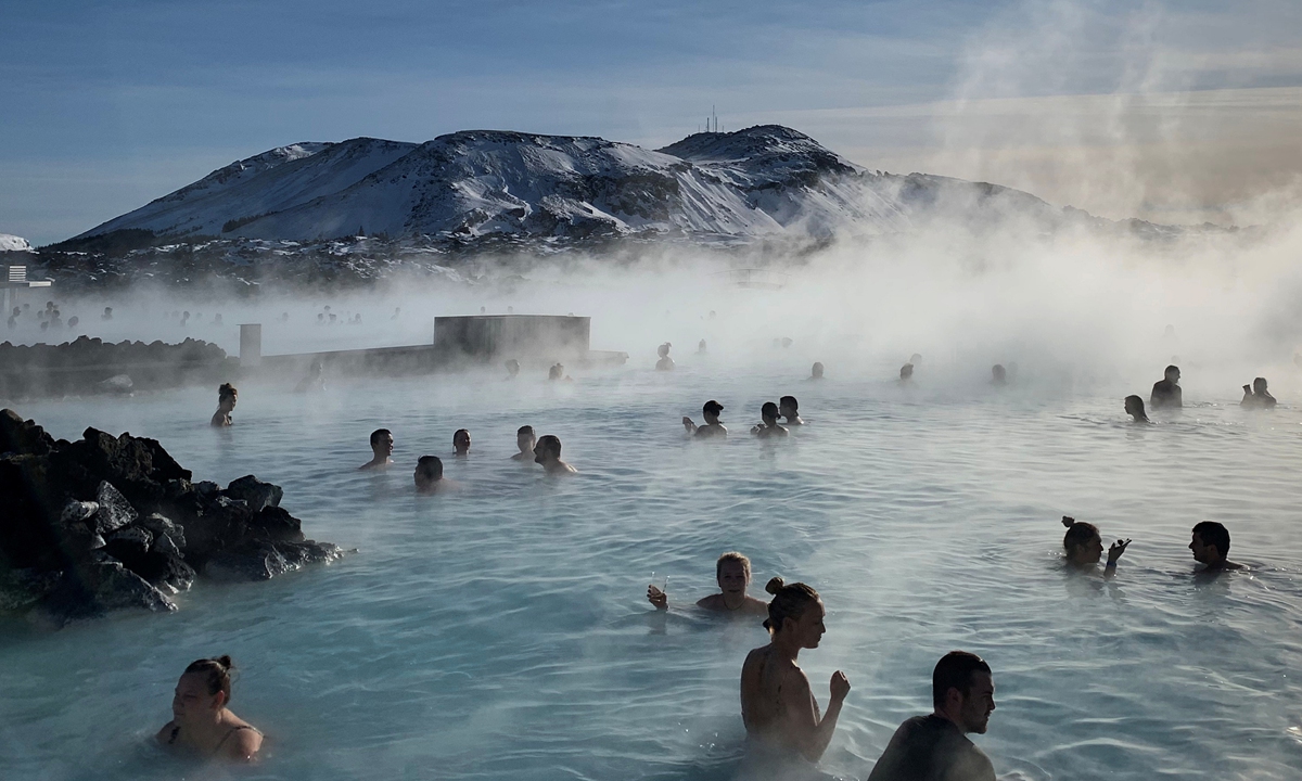 Bathers enjoy the warm volcanic hot springs of the Blue Lagoon in Grindavik, Iceland on March 6. Photo: VCG