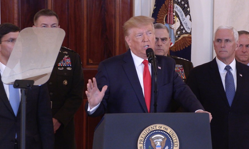 US President Donald Trump (C) delivers a statement at the White House in Washington D.C., the United States, Jan. 8, 2020. Photo:Xinhua