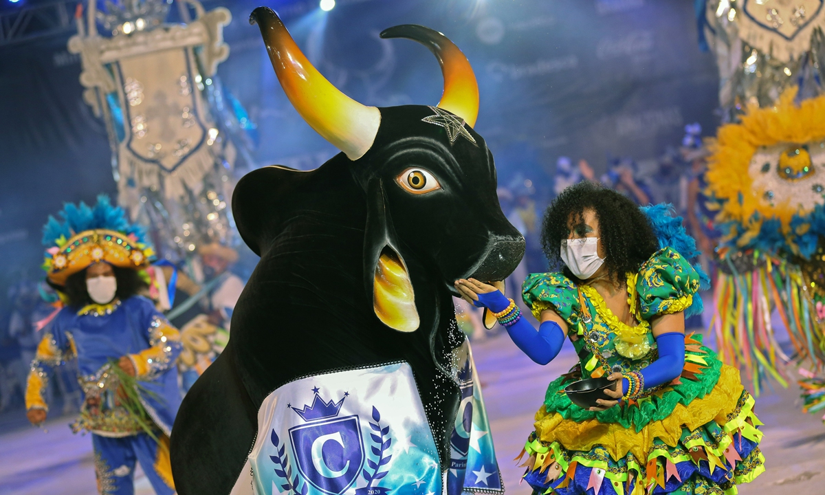 Dancers wearing face masks perform for a live streaming replacing the traditional Boi-Bumba folklore festival, canceled amid the pandemic, in Parintins, Amazonas state, Brazil, on Saturday. Photo: AFP
