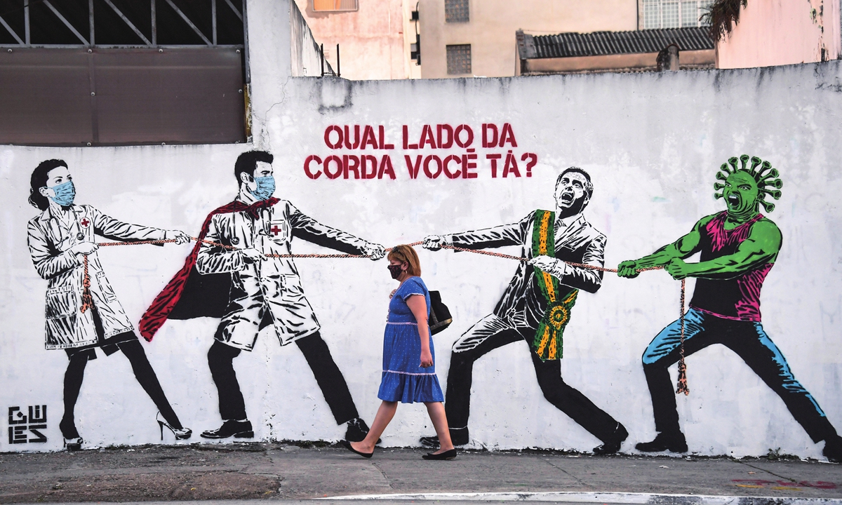 A woman walks by a wall with graffiti depicting Brazilian President Jair Bolsonaro and a figure representing COVID-19 in a tug of war against health workers with a phrase that reads in Portuguese "Which side of the rope are you on?" Photo: AFP