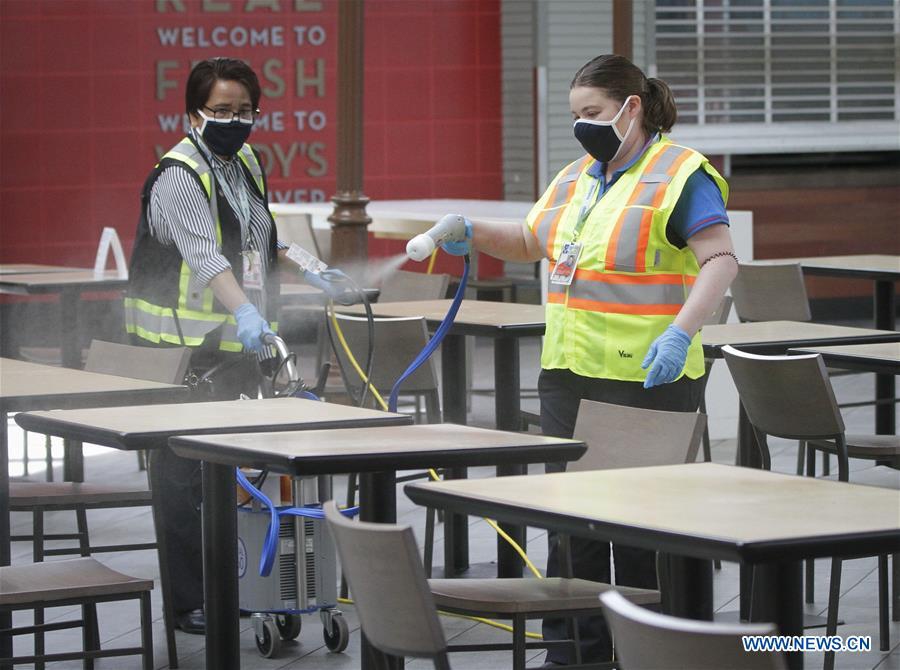 Airport employees spray disinfectant to tables and chairs at Vancouver International Airport in Vancouver, British Columbia, Canada, on June 18, 2020. Vancouver International Airport (YVR) announced on Thursday the launch of YVR TAKEcare, an operational program and health and safety campaign designed to help people move through the airport safely and with confidence. As of Thursday afternoon, Canada reported 100,148 confirmed COVID-19 cases and 8,299 deaths, according to CTV. (Photo by Liang Sen/Xinhua)
