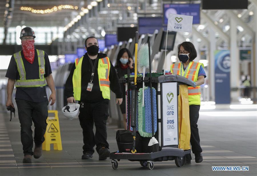 Airport employees wearing masks are seen at Vancouver International Airport in Vancouver, British Columbia, Canada, on June 18, 2020. Vancouver International Airport (YVR) announced on Thursday the launch of YVR TAKEcare, an operational program and health and safety campaign designed to help people move through the airport safely and with confidence. As of Thursday afternoon, Canada reported 100,148 confirmed COVID-19 cases and 8,299 deaths, according to CTV. (Photo by Liang Sen/Xinhua)