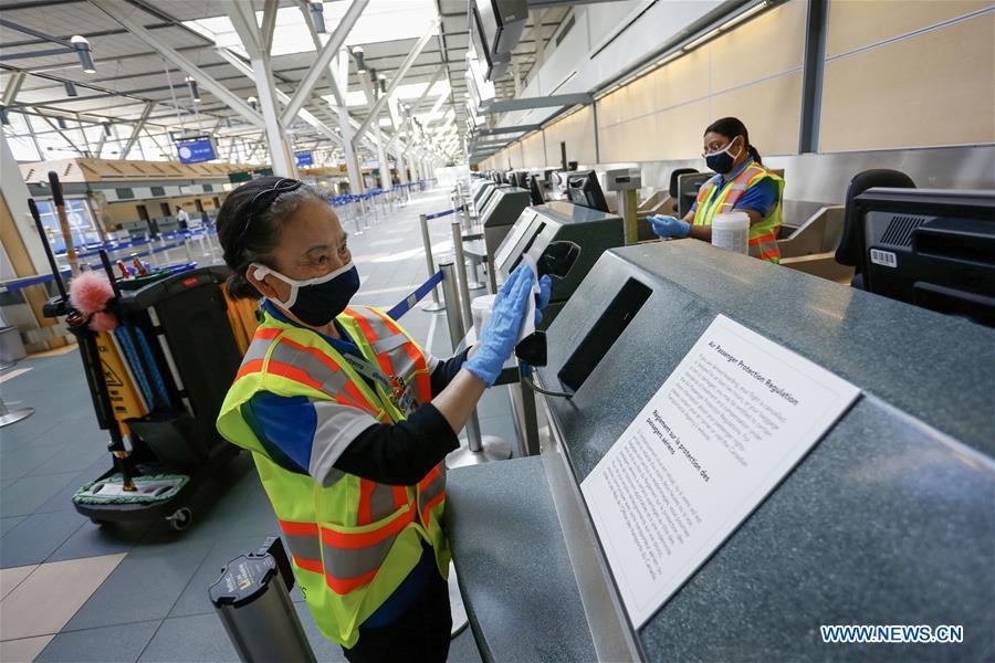 Airport employees clean check-in counters at Vancouver International Airport in Vancouver, British Columbia, Canada, on June 18, 2020. Vancouver International Airport (YVR) announced on Thursday the launch of YVR TAKEcare, an operational program and health and safety campaign designed to help people move through the airport safely and with confidence. As of Thursday afternoon, Canada reported 100,148 confirmed COVID-19 cases and 8,299 deaths, according to CTV. (Photo by Liang Sen/Xinhua)