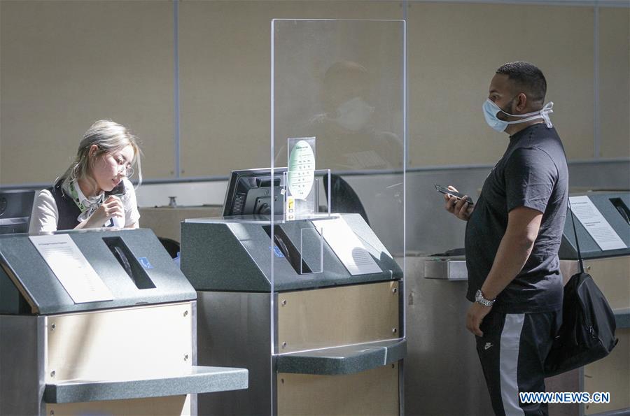 A shield is seen installed at a check-in counter of Vancouver International Airport in Vancouver, British Columbia, Canada, on June 18, 2020. Vancouver International Airport (YVR) announced on Thursday the launch of YVR TAKEcare, an operational program and health and safety campaign designed to help people move through the airport safely and with confidence. As of Thursday afternoon, Canada reported 100,148 confirmed COVID-19 cases and 8,299 deaths, according to CTV. (Photo by Liang Sen/Xinhua)