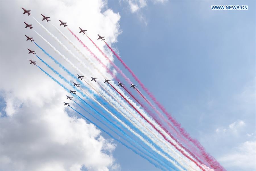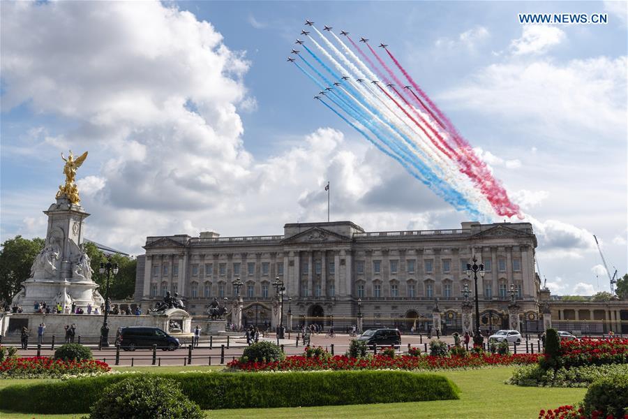 A formation of the Royal Air Force (RAF) Red Arrows and its French counterpart team La Patrouille de France flies above London, Britain, on June 18, 2020. British Prime Minister Boris Johnson and French President Emmanuel Macron held talks Thursday at 10 Downing Street, the first meeting between heads of state in Britain since the COVID-19 pandemic started. A flypast was performed afterwards above London by the Royal Air Force (RAF) Red Arrows and its French counterpart team, La Patrouille de France. (Photo by Ray Tang/Xinhua)