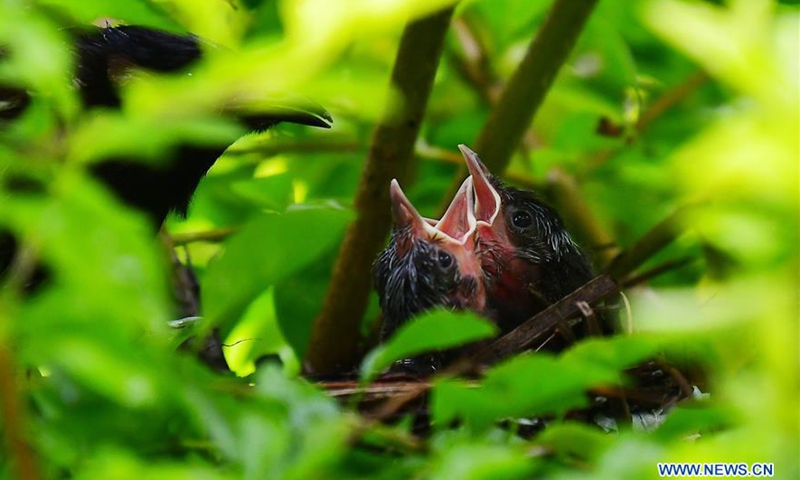 A bird feeds its chicks in a nest at Agartala, the capital city of India's northeastern state of Tripura, June 18, 2020. Photo:Xinhua