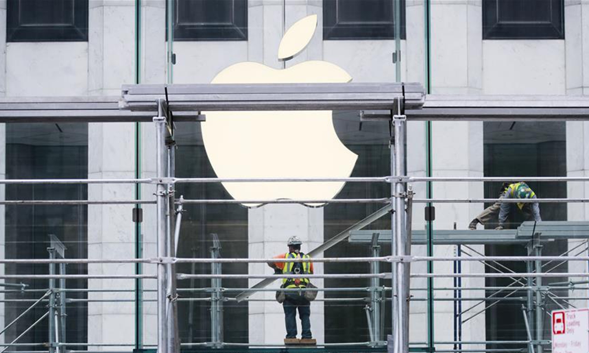 Workers remove the blocks around an Apple store on Fifth Avenue during the phase one reopening in New York, the United States, June 12, 2020. (Xinhua/Wang Ying)