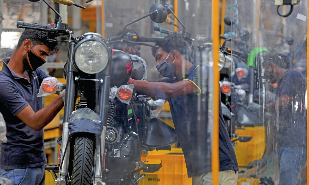 Workers assemble Royal Enfield motorcycles at a factory in Oragadam, India on Tuesday after the government eased nationwide lockdown measures aimed at preventing the spread of COVID-19. Photo: AFP