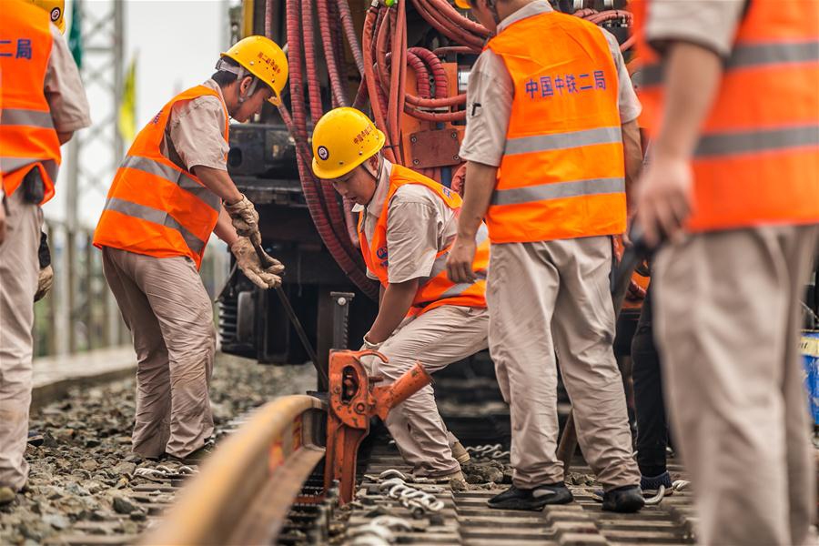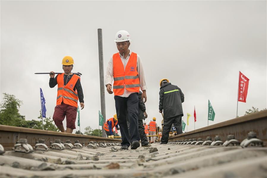 Workers from China Railway No.2 Engineering Group (CREC-2) screw the welded seamless rails of the China-Laos railway in the northern suburb of Vientiane, Laos, on June 18, 2020. The CREC-2 has welded the first seamless rails for the China-Laos railway in the northern suburb of Lao capital Vientiane on Thursday morning. The seamless rail, also known as continuous welded rail (CWR) which eliminates rail joints, can improve the duration of steel rails, reduce the maintenance costs of locomotives and tracks, improve the stability and speed of trains, and enhance travel comfort. The China-Laos Railway is a project of the China-proposed Belt and Road Initiative, with a joint effort, aiming to convert Laos from a landlocked country to a land-linked hub. The project started in December 2016 and is scheduled to be completed and open to traffic in December 2021. (Photo by Kaikeo Saiyasane/Xinhua)