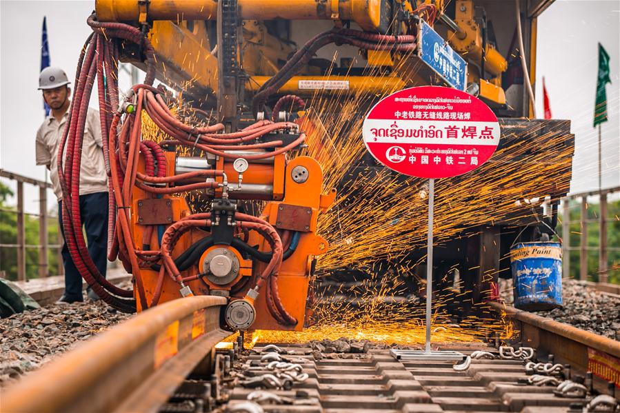 A worker from China Railway No.2 Engineering Group (CREC-2) welds the first seamless rails for the China-Laos railway in the northern suburb of Vientiane, Laos, on June 18, 2020. The CREC-2 has welded the first seamless rails for the China-Laos railway in the northern suburb of Lao capital Vientiane on Thursday morning. The seamless rail, also known as continuous welded rail (CWR) which eliminates rail joints, can improve the duration of steel rails, reduce the maintenance costs of locomotives and tracks, improve the stability and speed of trains, and enhance travel comfort. The China-Laos Railway is a project of the China-proposed Belt and Road Initiative, with a joint effort, aiming to convert Laos from a landlocked country to a land-linked hub. The project started in December 2016 and is scheduled to be completed and open to traffic in December 2021. (Photo by Kaikeo Saiyasane/Xinhua)