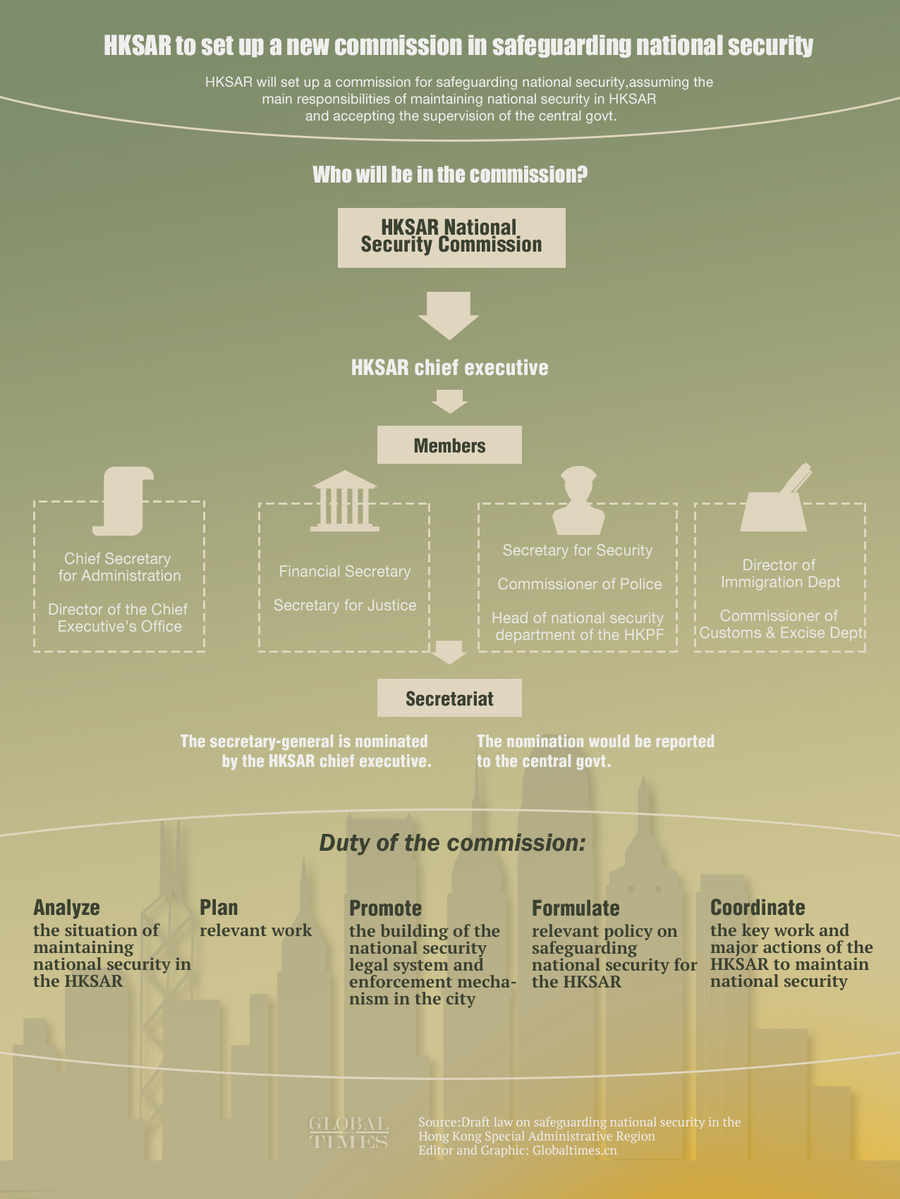 The Hong Kong Special Administrative Region (HKSAR) will set up a commission for safeguarding national security, assuming the main responsibilities of maintaining national security in HKSAR and accepting the supervision of the central government, according to detailed provisions of the draft law on national security for Hong Kong released on Saturday.